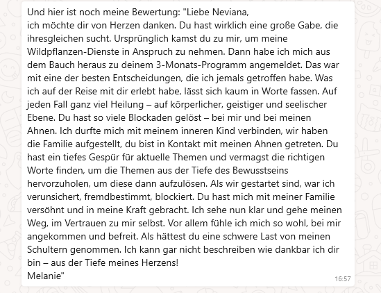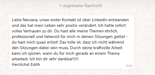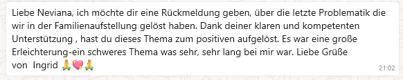 Liebe Neviana, ich kenne deine Arbeit nun schon seit längerer Zeit und bewundere sie sehr. Selbst bei sehr komplexen familiären Belastungen erlebe ich deine Begleitung als ausgesprochen klärend und hilfreich. Du trägst dazu bei, dass die Ursachen der Konflikte und Belastungen jeglicher Natur in den Familien aufgelöst werden, wodurch eine neue und gerechte Ordnung und positive Dynamik entsteht – dabei immer warmherzig, sorgfältig, sehr vertrauenswürdig und von höchster Qualität.