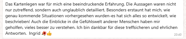 dass Sie sich die Zeit genommen haben, die Erfahrungen und Stimmen meiner Kunden zu lesen. Es ist mir eine Herzensangelegenheit, jeden Menschen auf seinem individuellen Weg zu Heilung, Klarheit und innerer Transformation zu begleiten. Wenn auch Sie bereit sind, alte Muster loszulassen, neue Wege zu gehen oder tiefe Heilung zu erfahren, freue ich mich darauf, Sie zu unterstützen. Lassen Sie uns gemeinsam Ihren Weg gestalten.